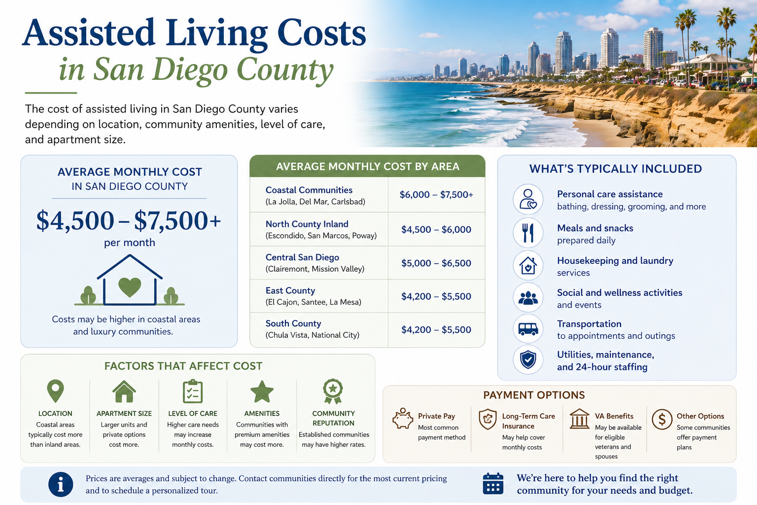These ranges reflect a broad cross-section of communities across the county. Inland communities in areas like Santee, La Mesa, and El Cajon generally offer more competitive pricing than coastal neighborhoods such as La Jolla, Coronado, or Point Loma — while still delivering high-quality care and resort-style amenities.