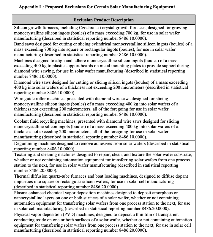 USTR expects to soon launch the machinery exclusion process as well as the comment period for proposed tariff rate changes on certain tungsten, wafer and polysilicon tariff lines.