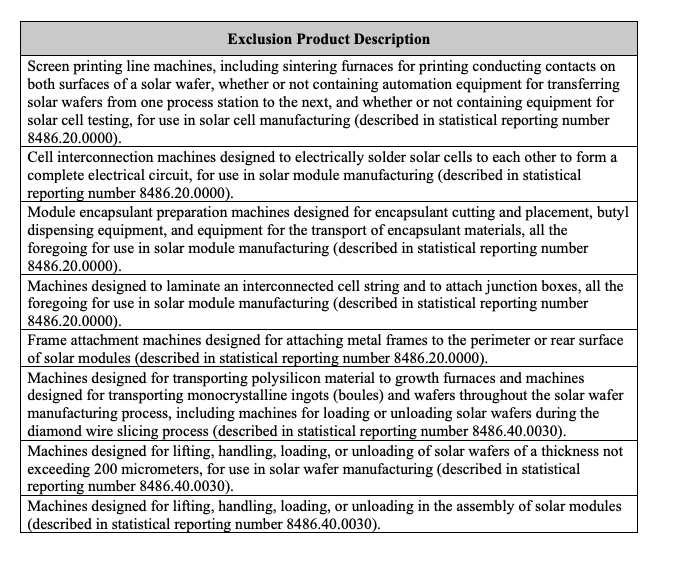 USTR expects to soon launch the machinery exclusion process as well as the comment period for proposed tariff rate changes on certain tungsten, wafer and polysilicon tariff lines.